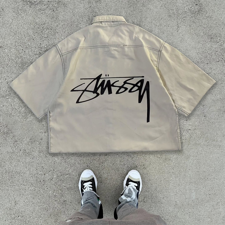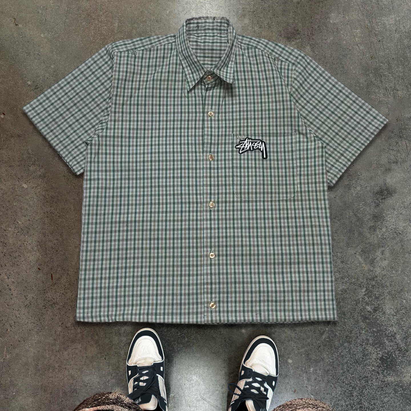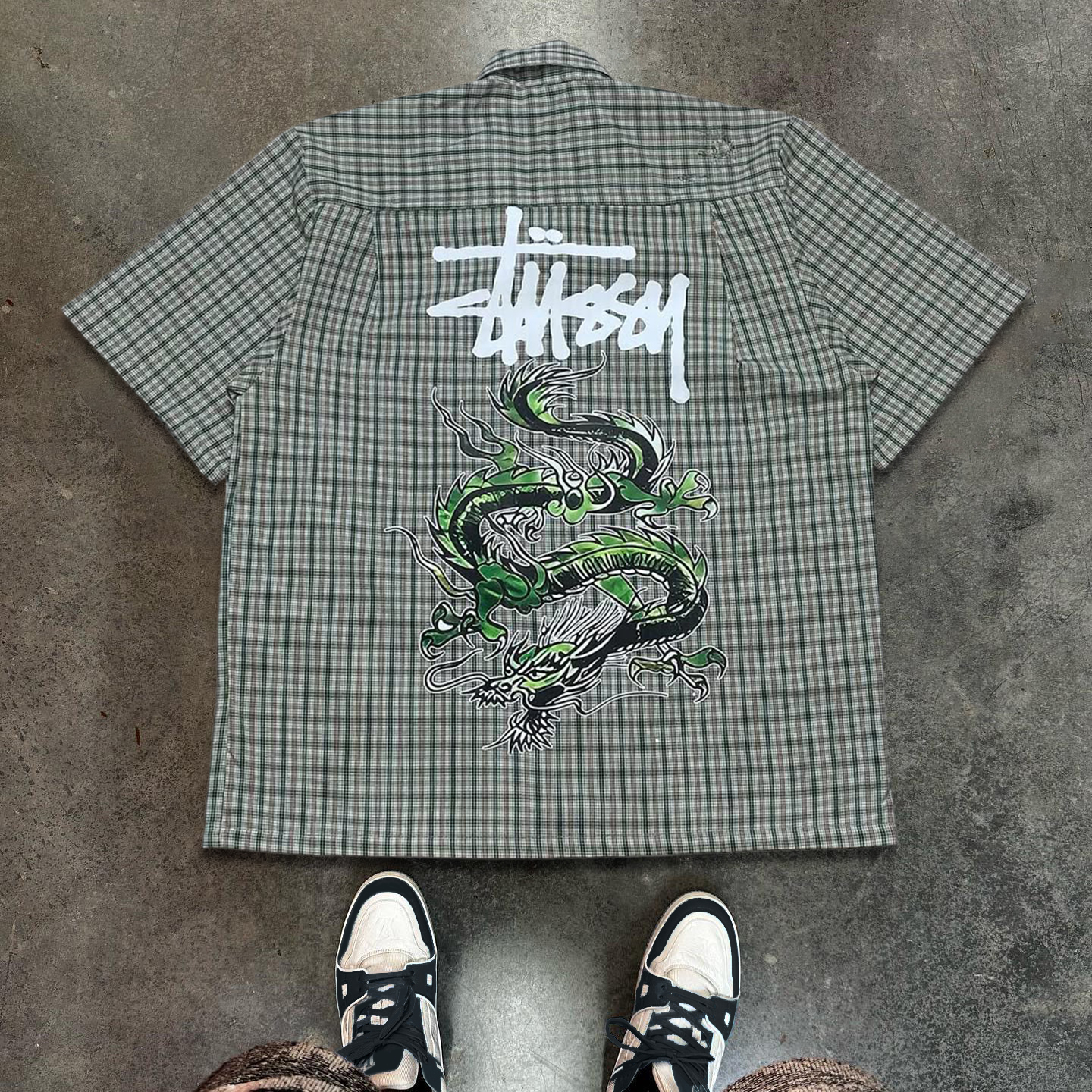 Letters Dragon Plaid Print Button Short Sleeve Shirt