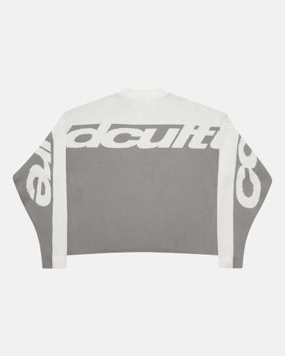 Boxy fit knit jersey.100% Cotton Gauge 12.Grey & White color.Curved logo on the back.Cold Culture label included.