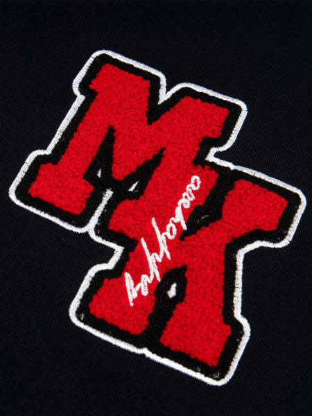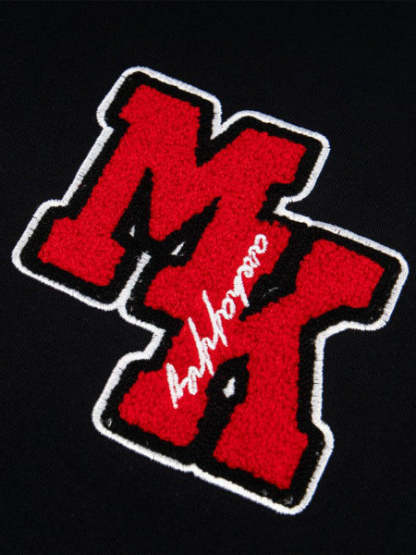 • Design Elements: Large embroidered letters on the chest, cursive text on the sleeve, small logo patches on both sleeves