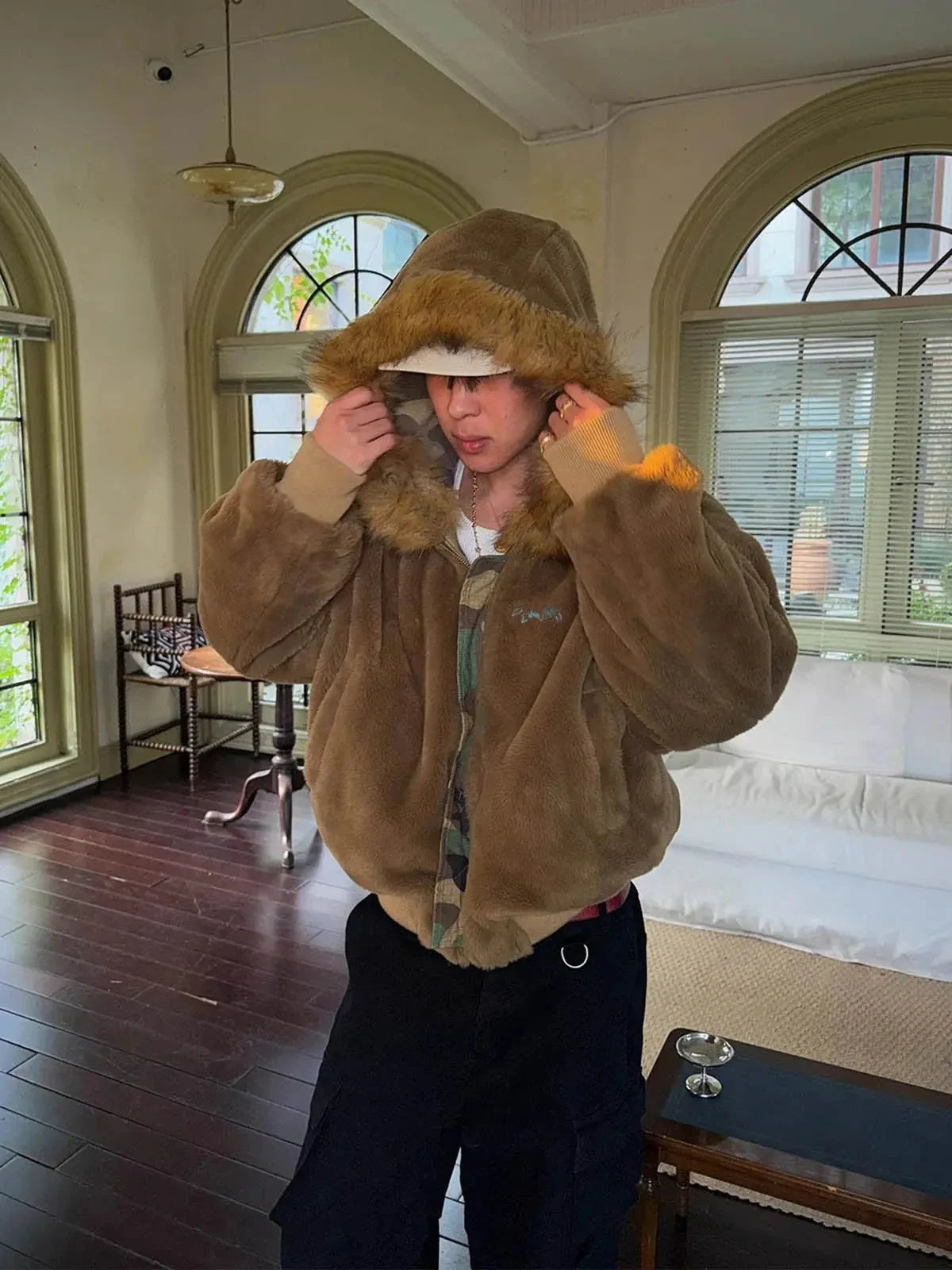 • Design Elements: Camouflage pattern, faux fur-lined hood, front zipper closure