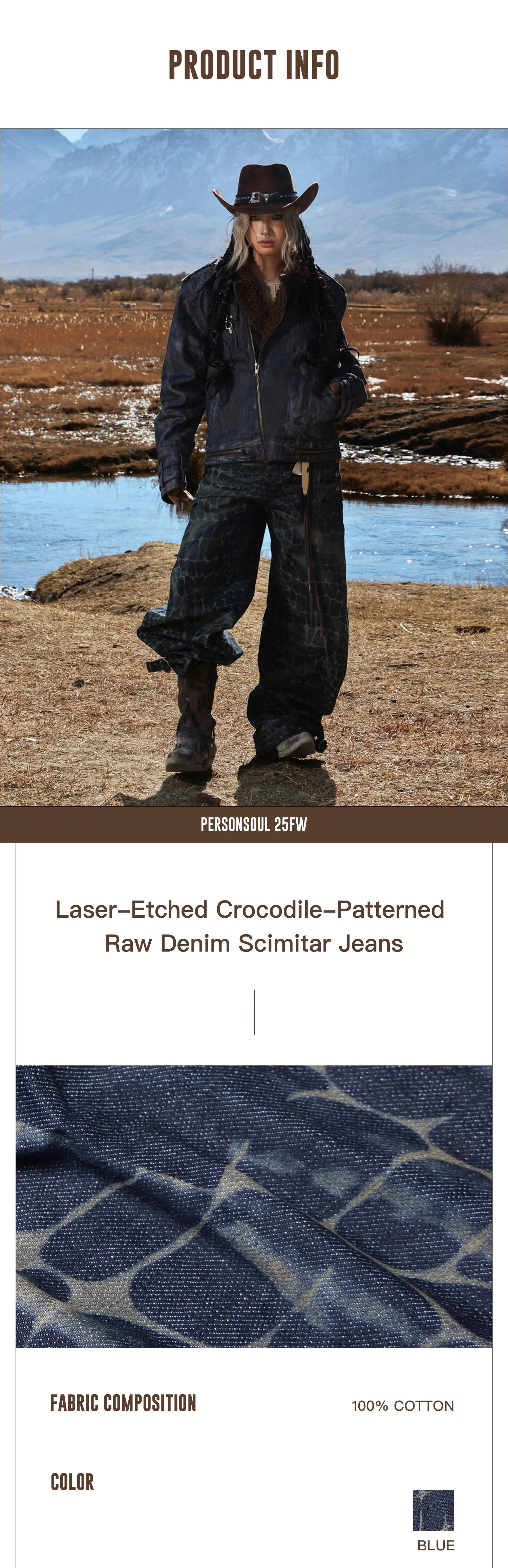 Personsoul Laser-Etched Crocodile-Patterned Raw Denim Curved Jeans