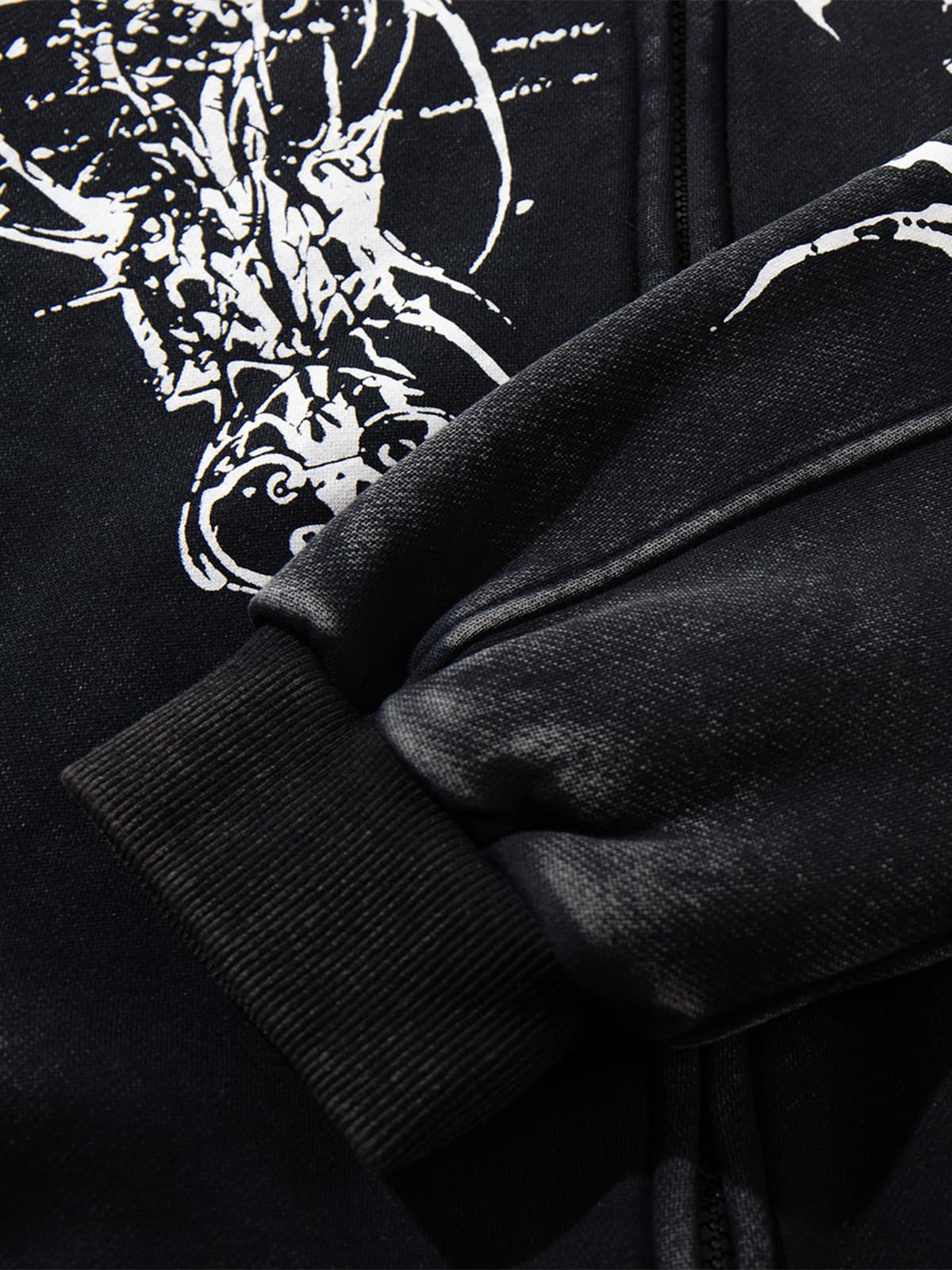 •    Design Elements: Intricate skull patterns, distressed hem details