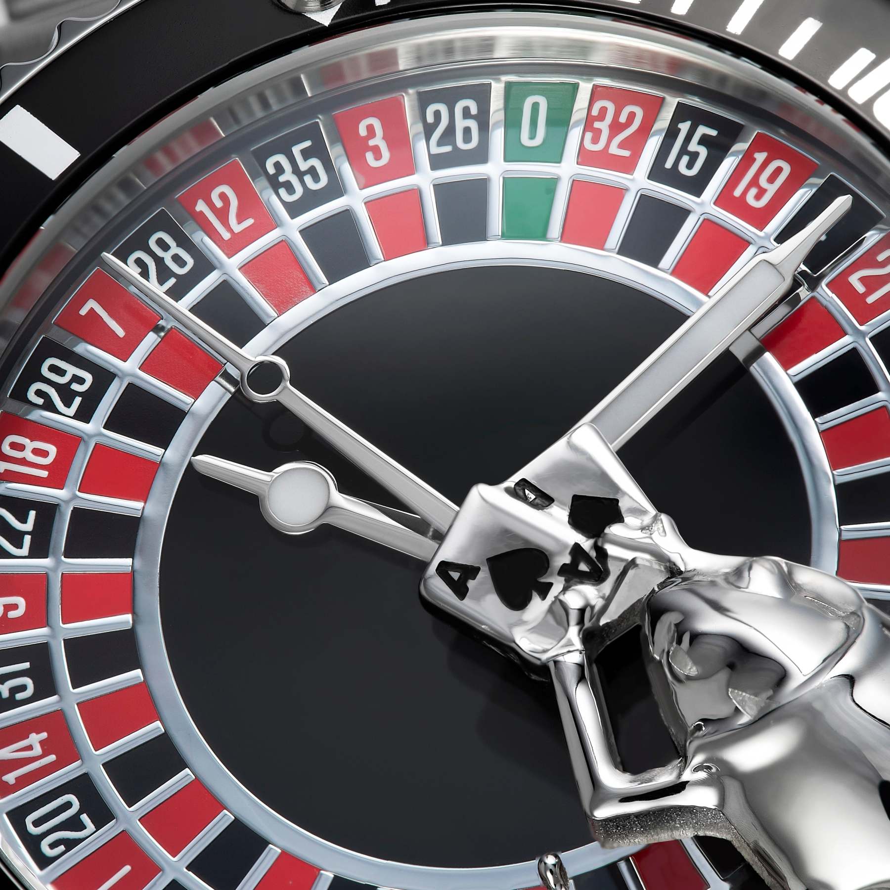 solid stainless steel / JAPANESE MIYOTA 8215 automatic movement / rotating unique roulette table / frog playing card ontop of the watch / luminous effect / up to 10 ATM (waterproof) / approx. 43mm
