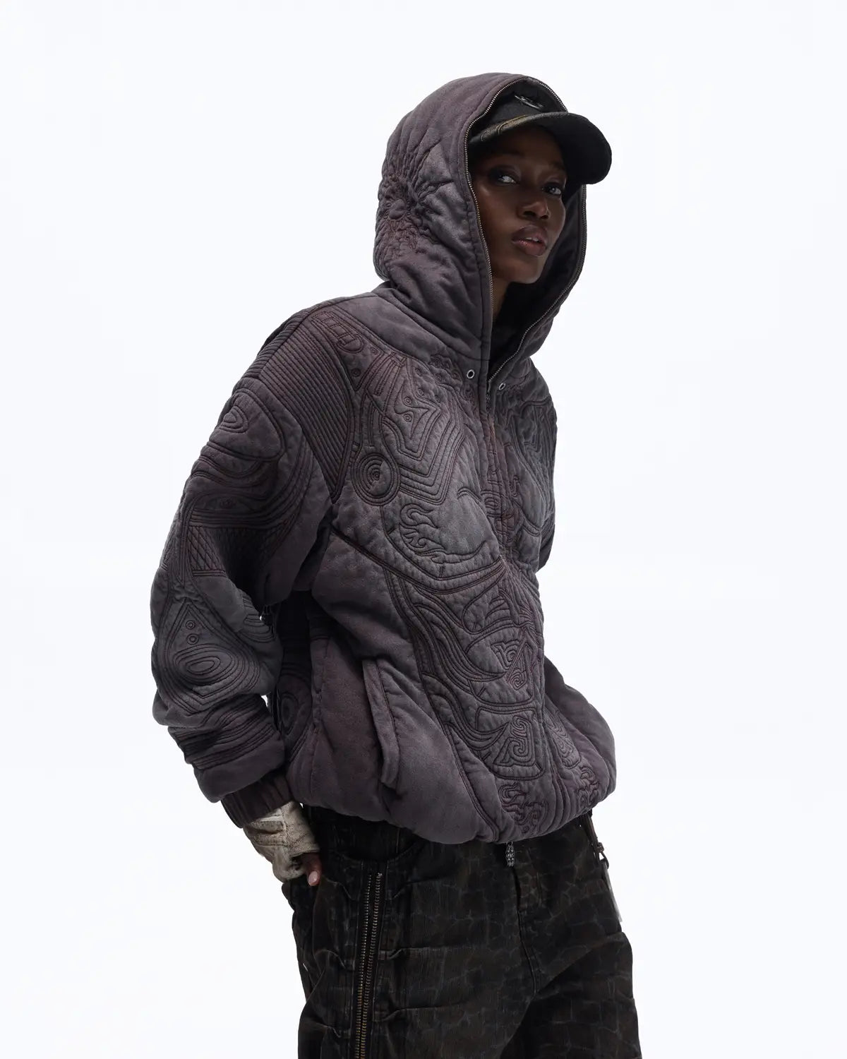 Personsoul Textured Full-Zip Hoodie with Chinese Motif Embroidery