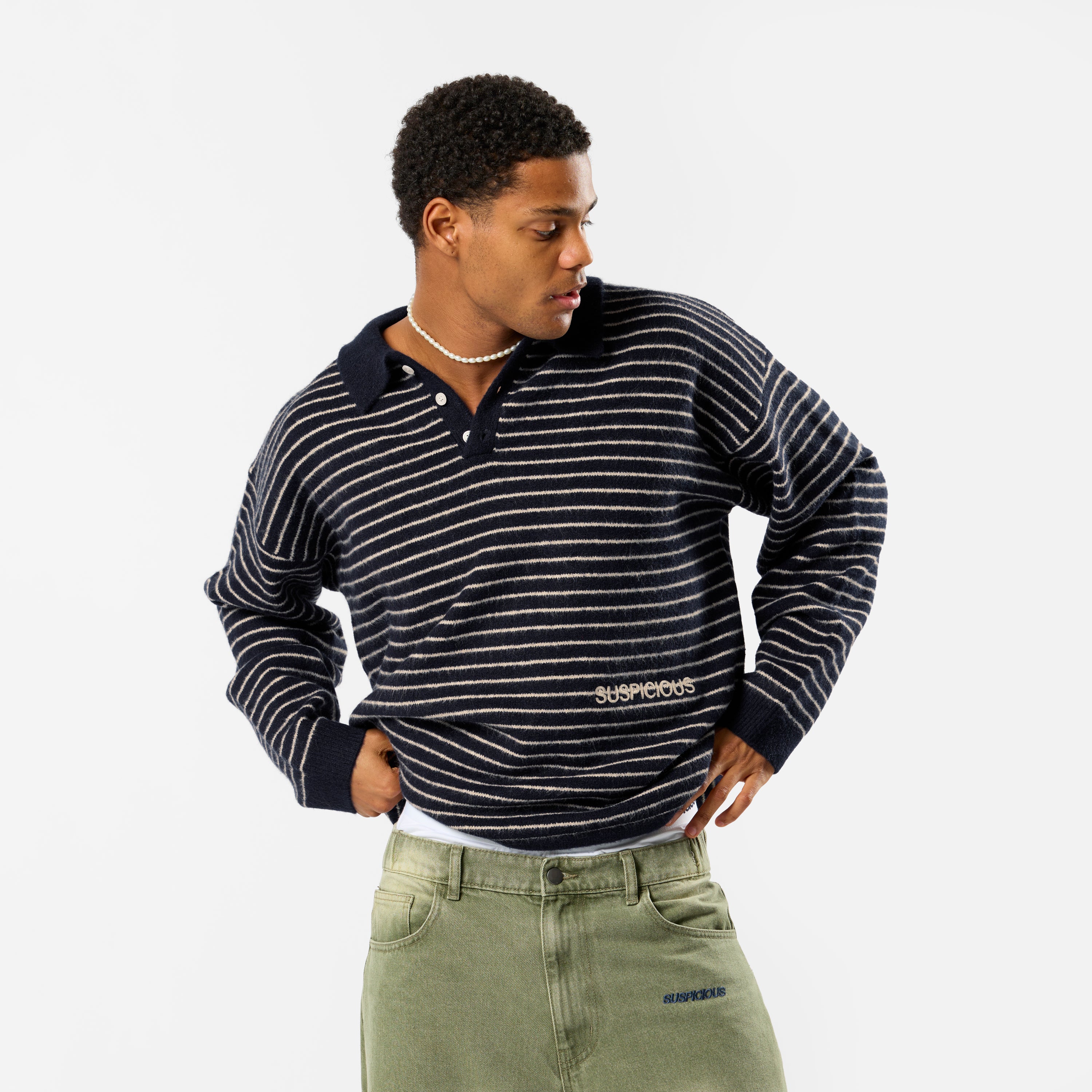 Polkaline / Striped Knitted Longsleeve Polo - Nightfall