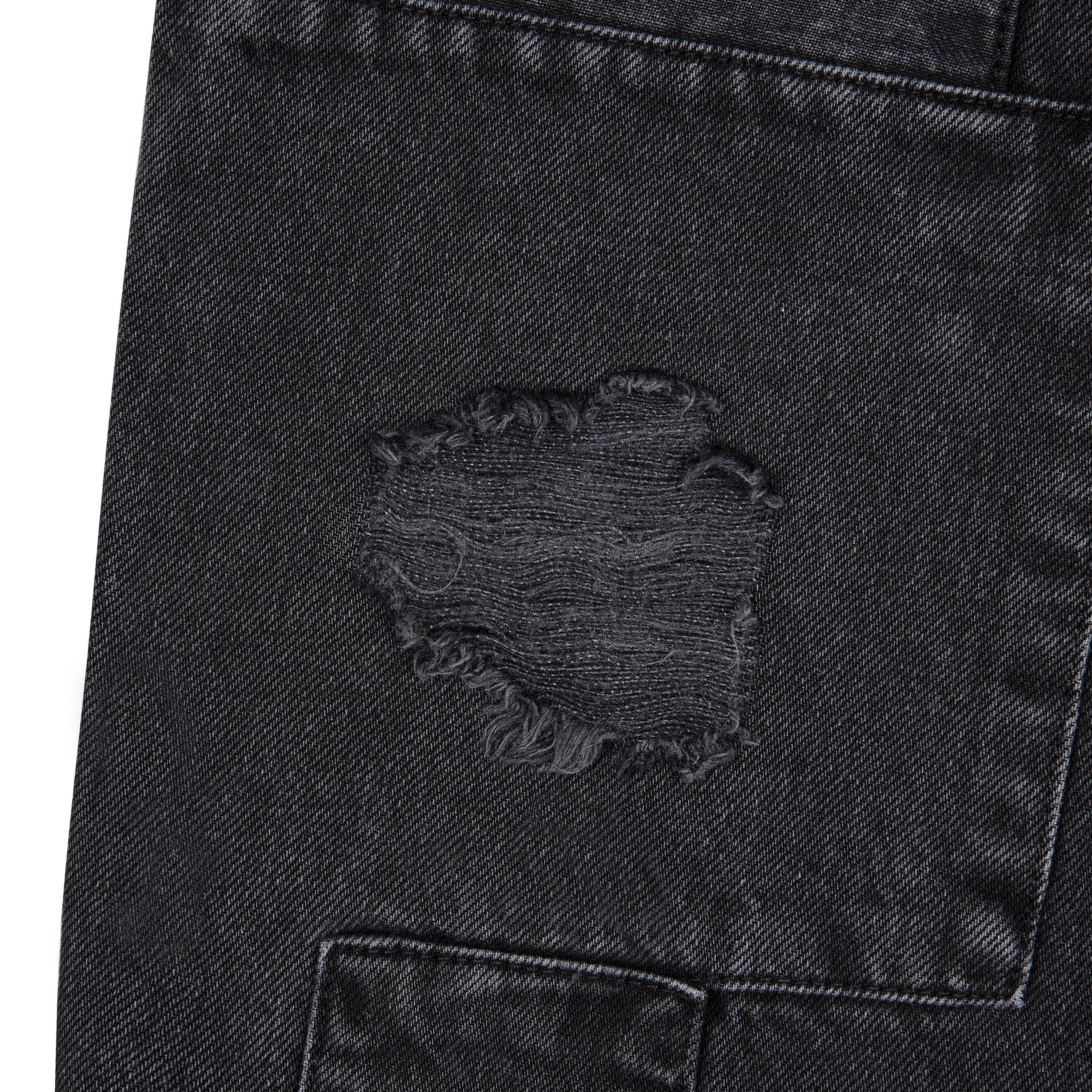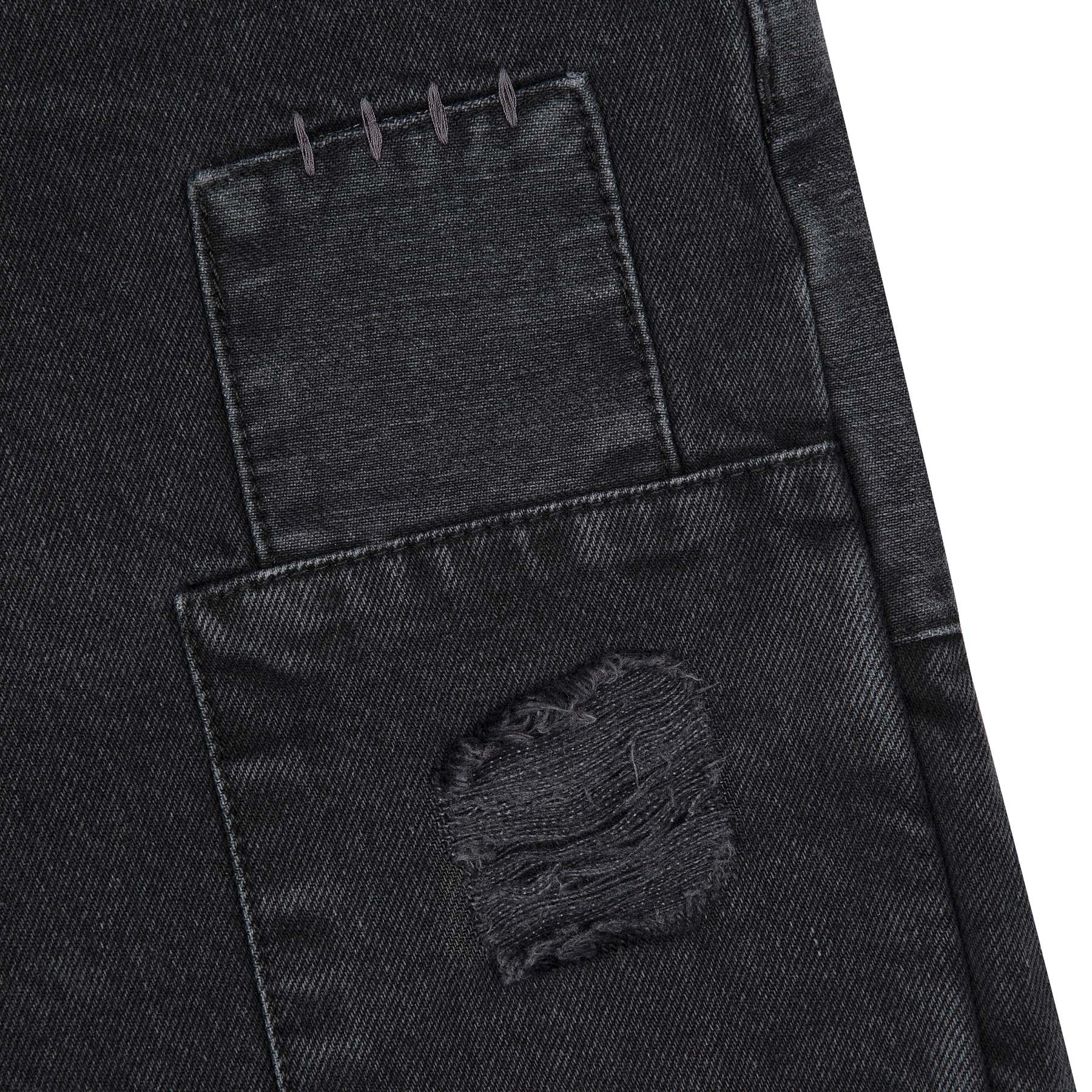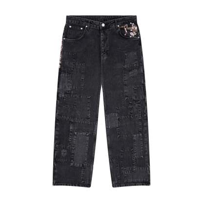14,5oz denim / 100% cotton / 20+ hand sewn patches all over / embroidery on front pocket and back / embroidered leather patch / washed effect / distressed patches / wash inside out / fits true to size
