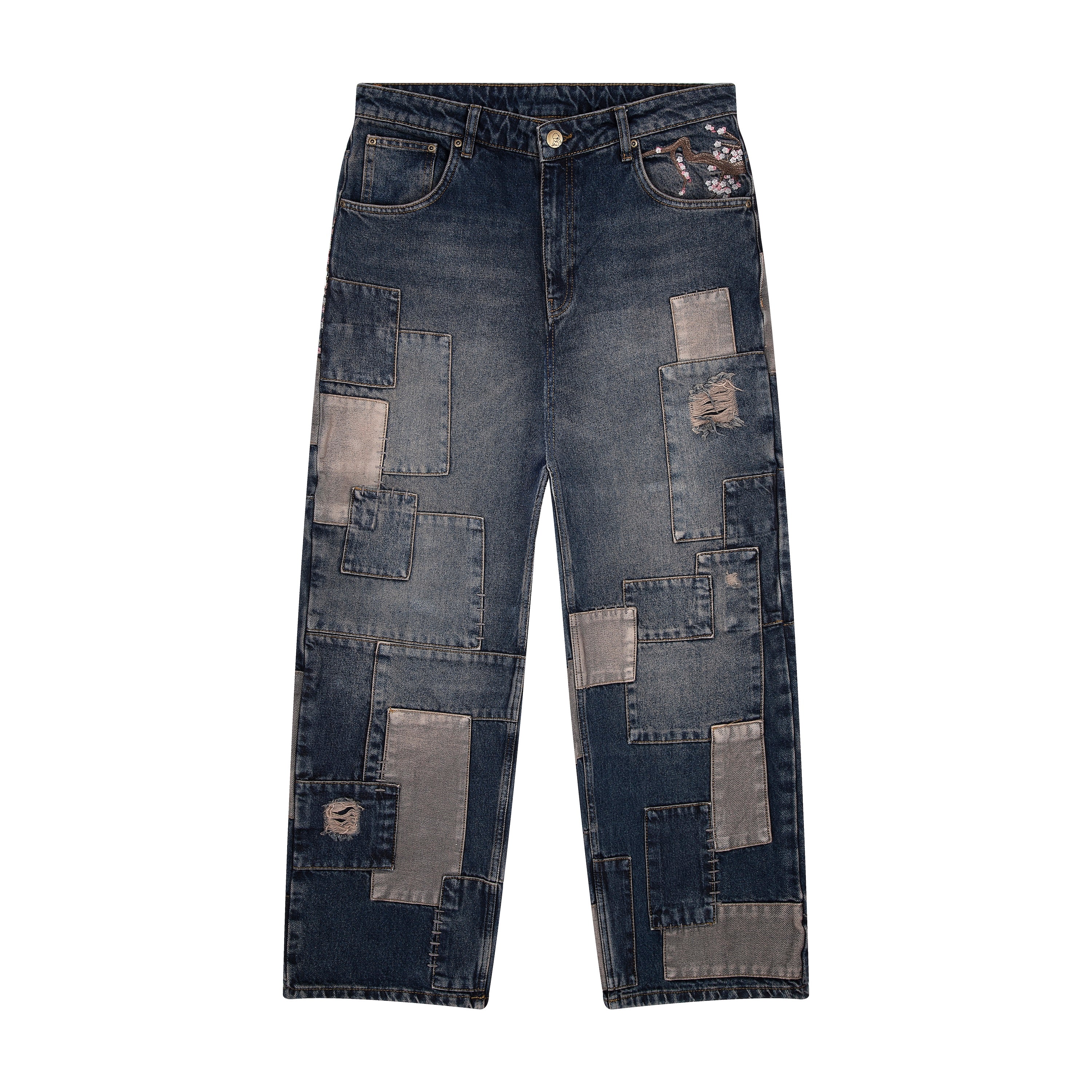 14,5oz denim / 100% cotton / 20+ hand sewn patches all over / embroidery on front pocket and back / embroidered leather patch / washed effect / distressed patches / wash inside out / fits true to size