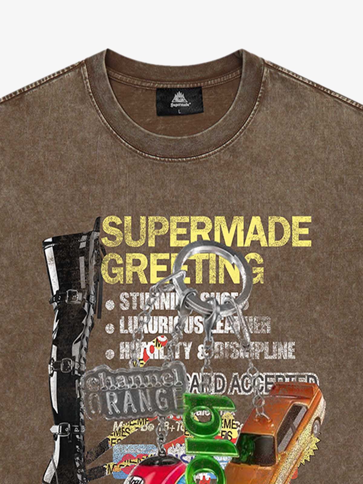 • Design Elements: Eye-catching graphic print with layered text and imagery, bold color contrasts, unique chain accessory design