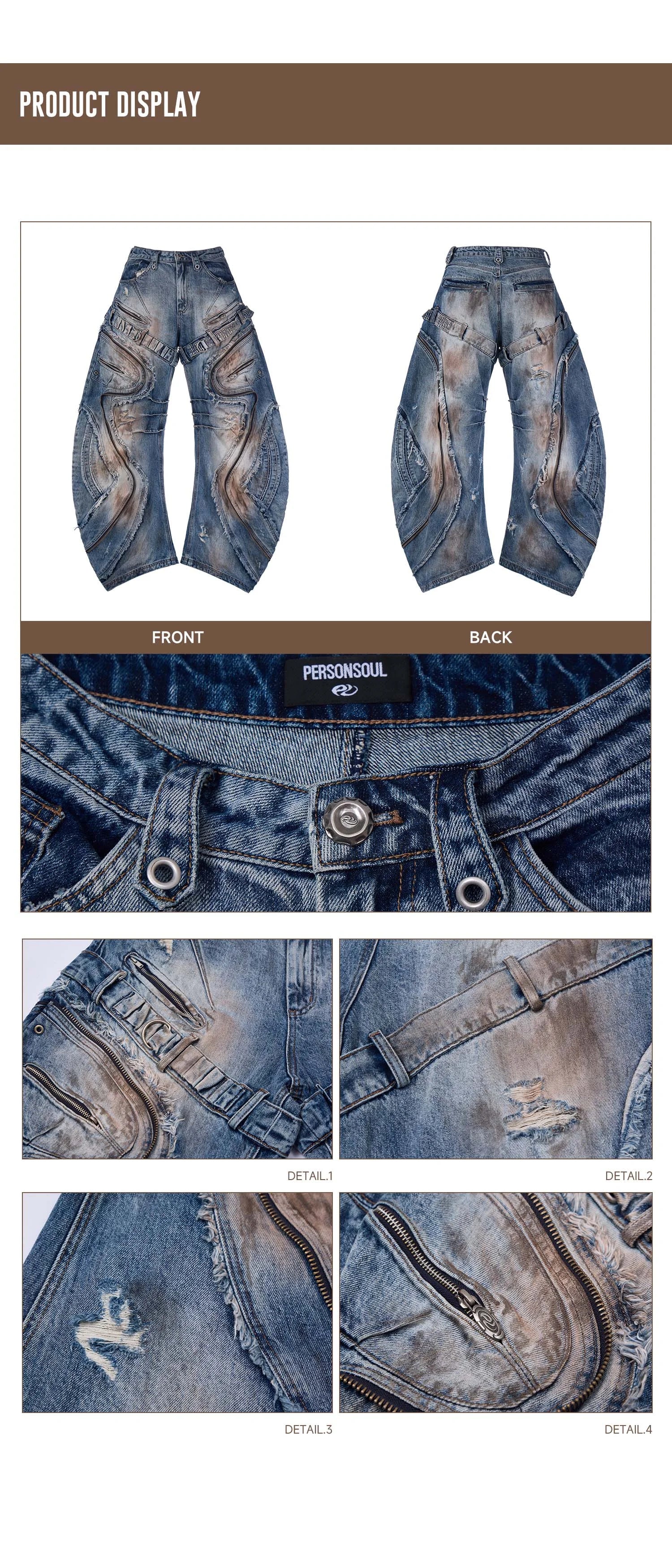 Curved Blade Pleated Jeans with Distressed Wash