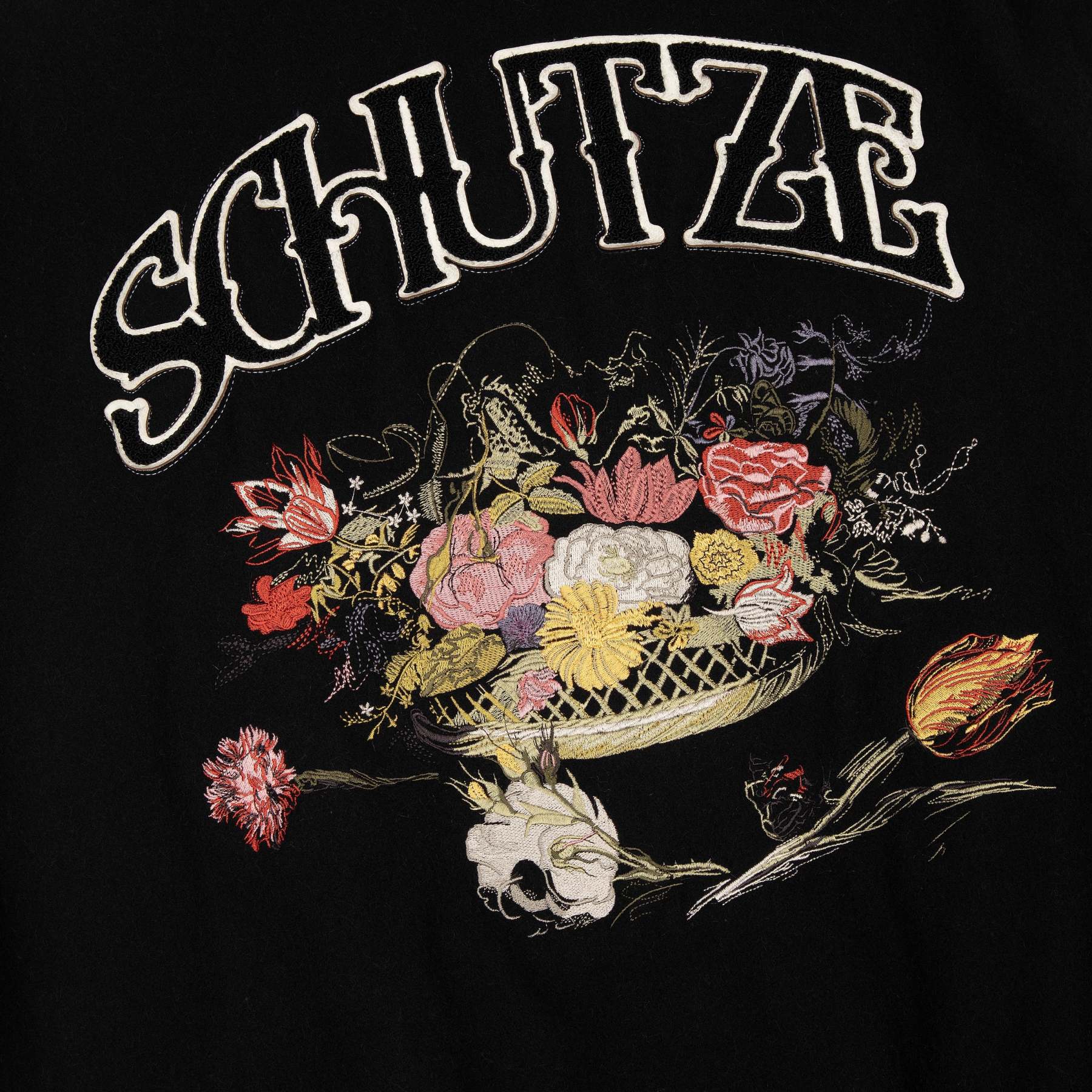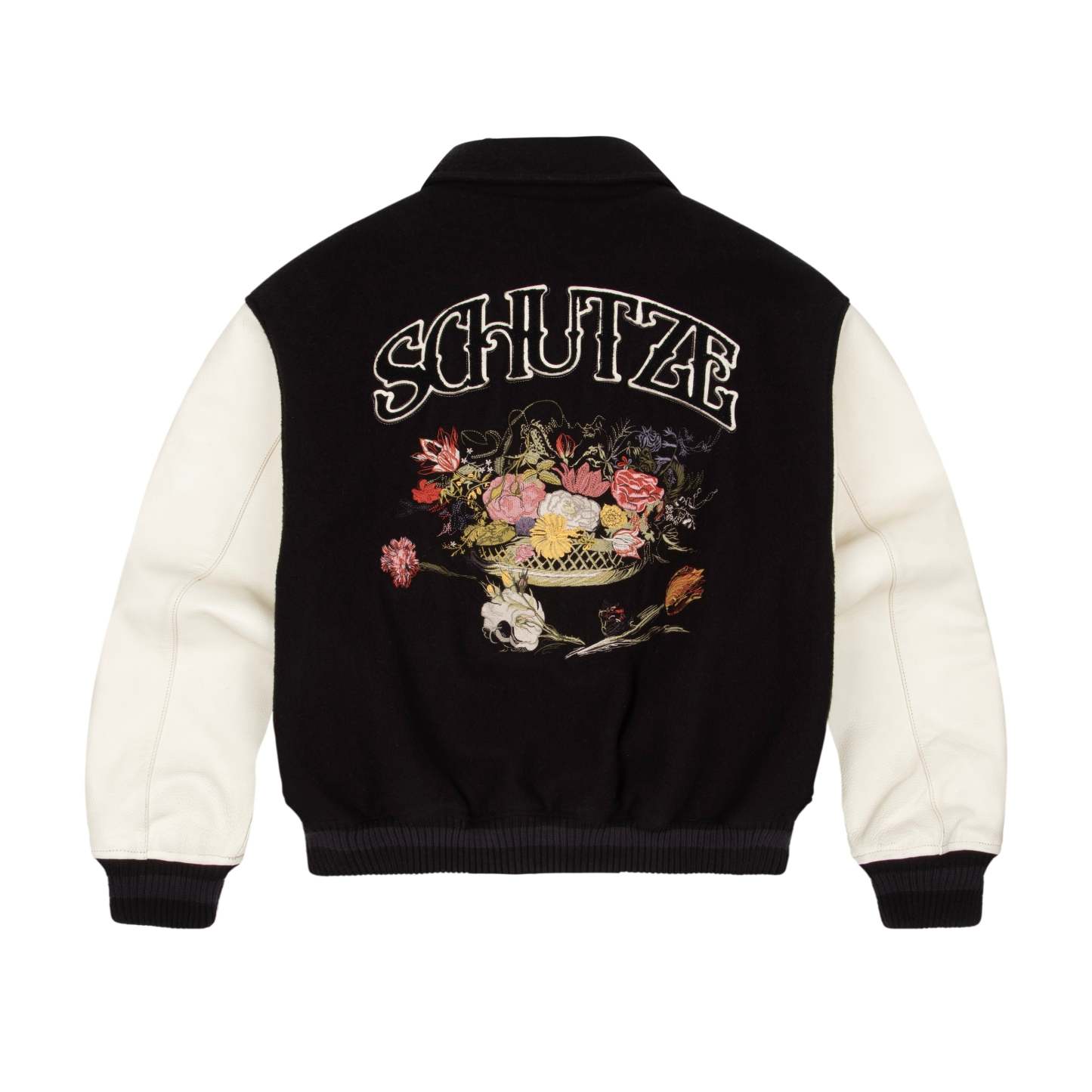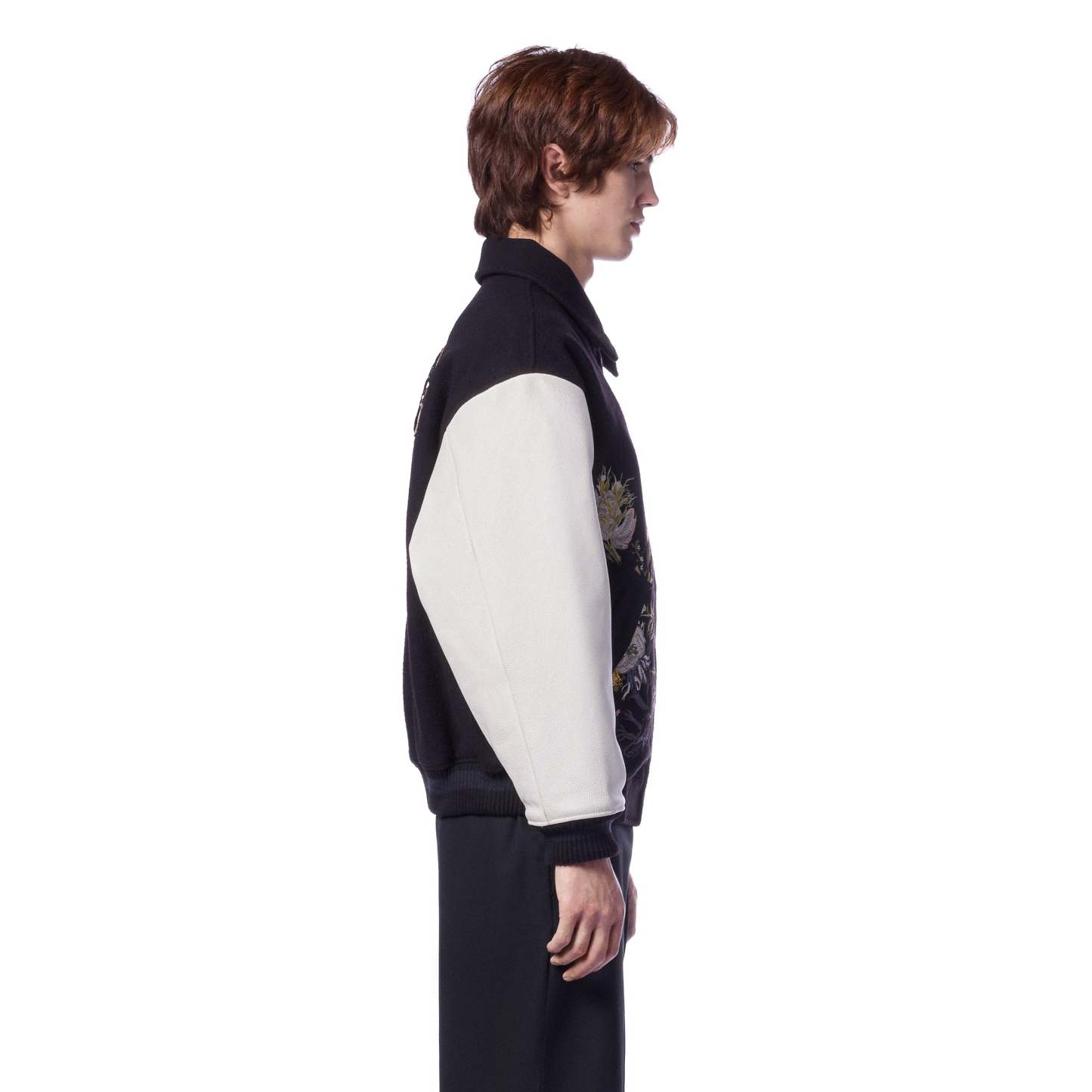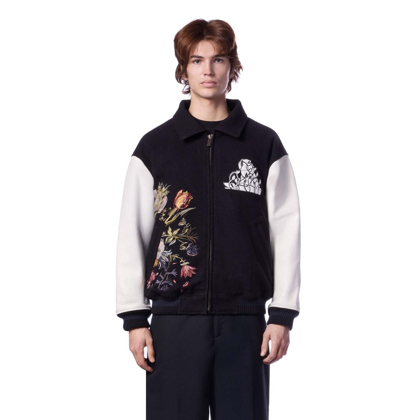 wool fabric / 100% plain leather sleeves / polyester lining / ribbed hem and cuffs / embroidery on front and back / leather appliqué embroidery on front chest / with YKK zipper / fits true to size