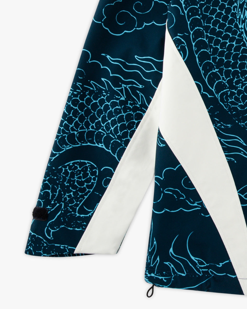 3-layer technical shell in a deep green base, covered with contrast artwork of a Japanese dragon and phoenix swirling through clouds. Built for movement, with adjustable cords, breathable mesh lining, and water-resistant features throughout.