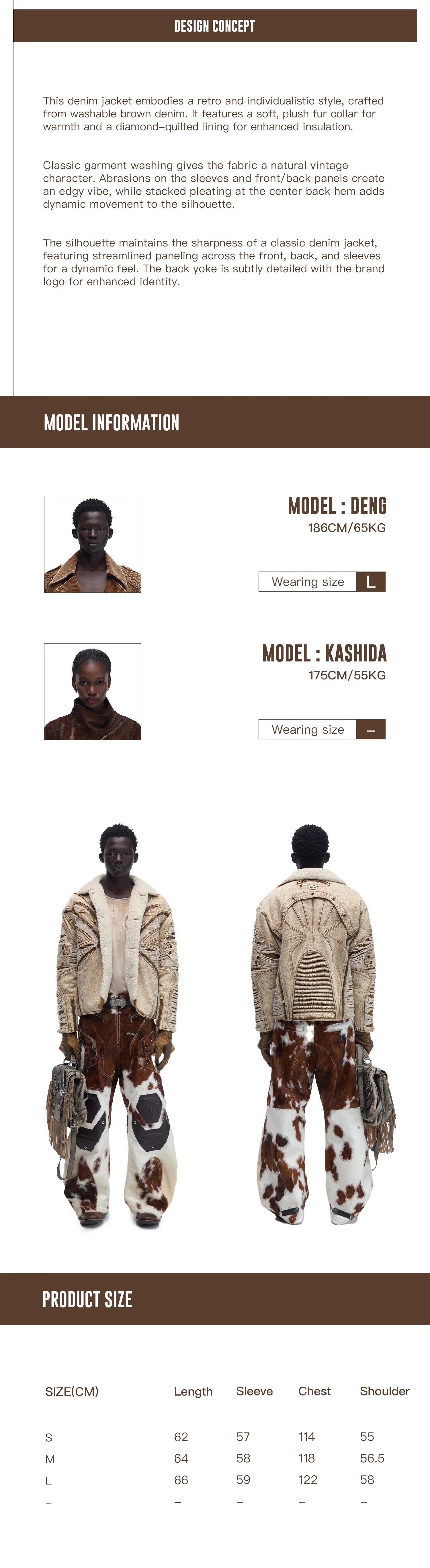 Personsoul Distressed Brown Denim Jacket with Faux-Fur Collar