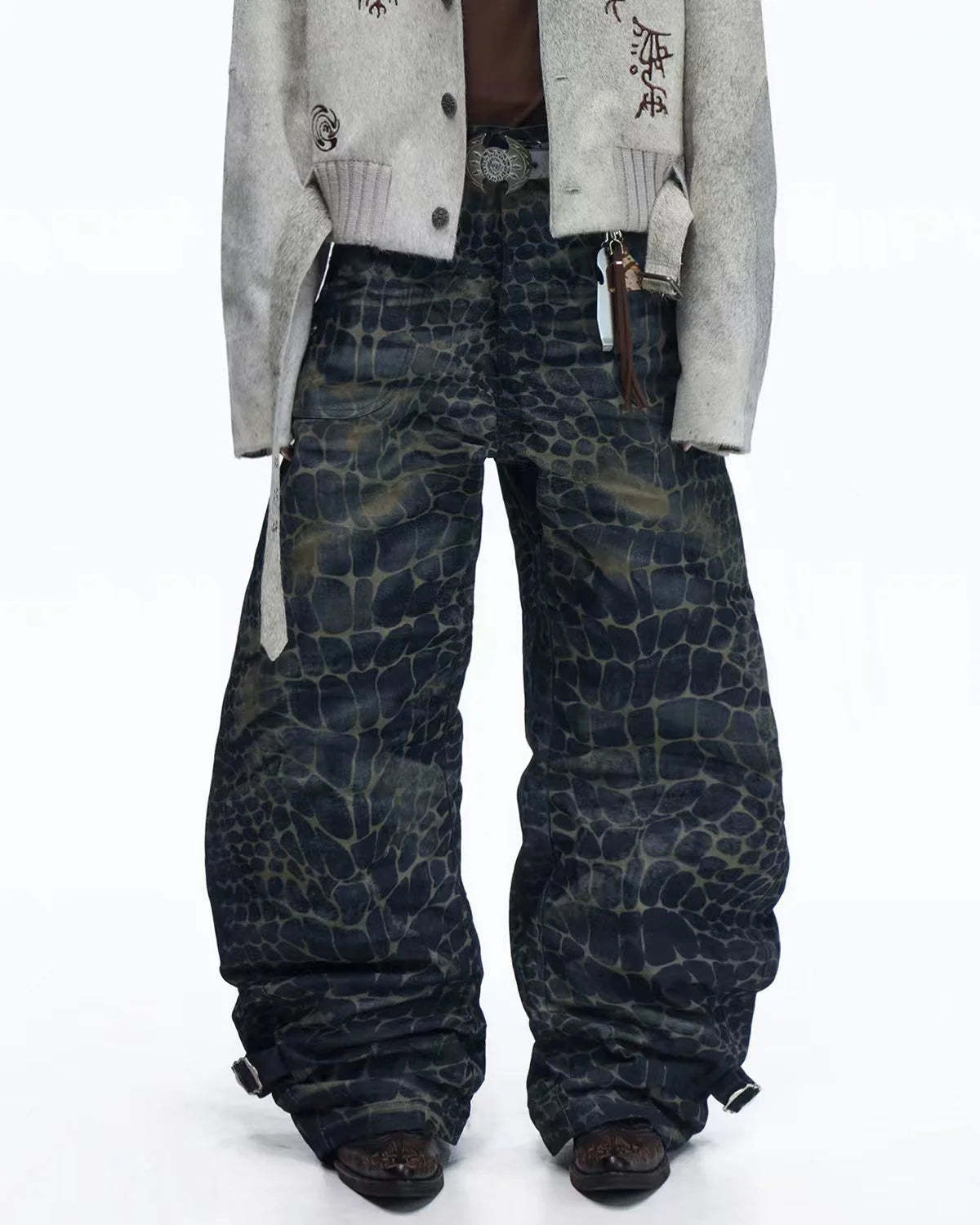 Personsoul Laser-Etched Crocodile-Patterned Raw Denim Curved Jeans