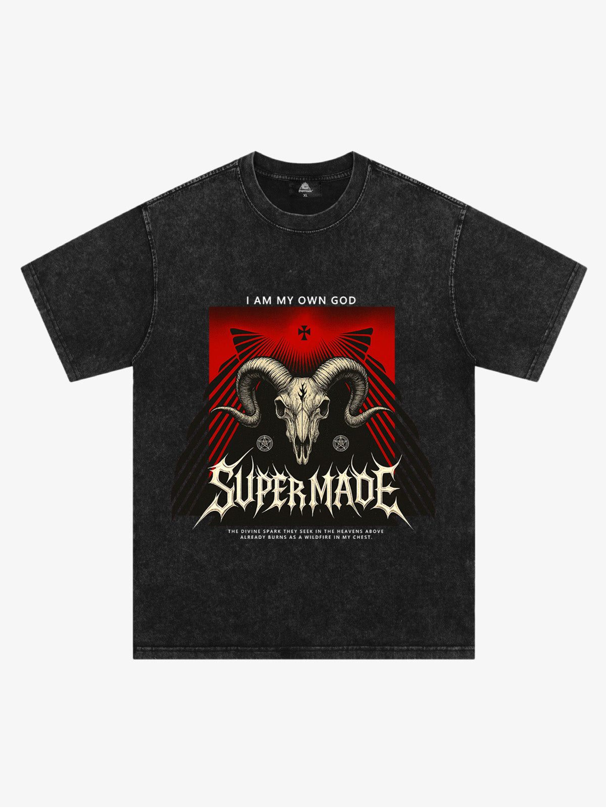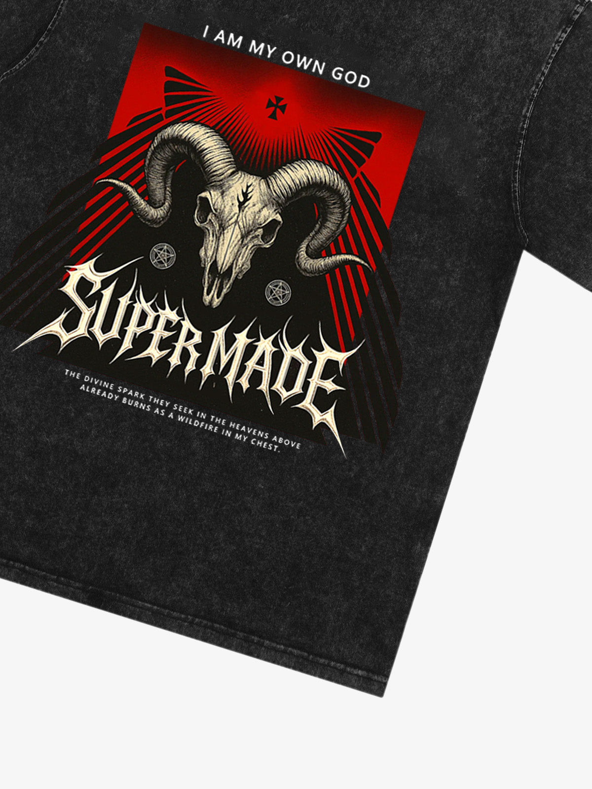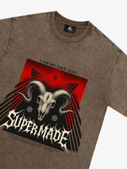 • Design Elements: Intricate ram skull graphic, bold text statement, geometric patterns