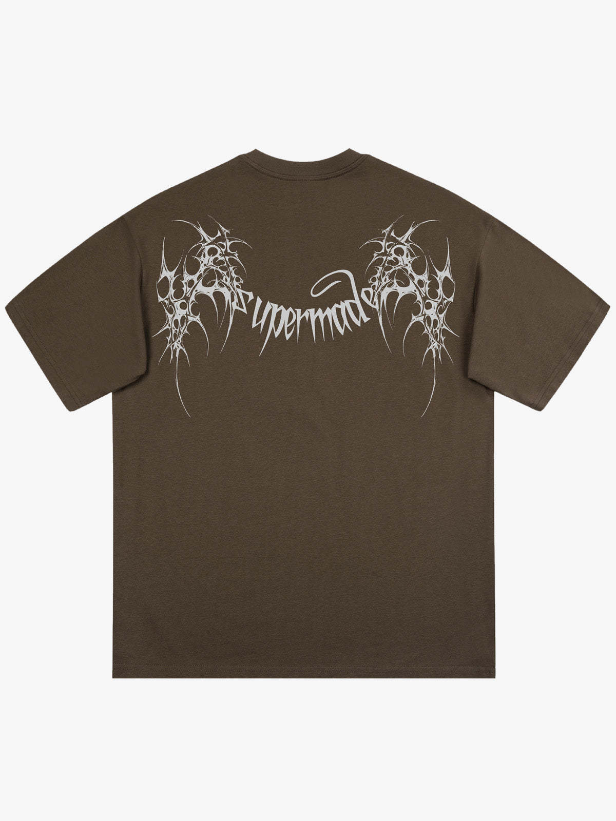 • Design Elements: Symmetrical Spiky Wing Motifs, Bold Script Lettering, High-Contrast White Print on Black Base