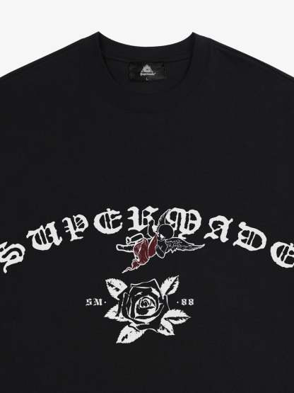 • Design Elements: Bold graphic print with floral motifs, classic crew neck design