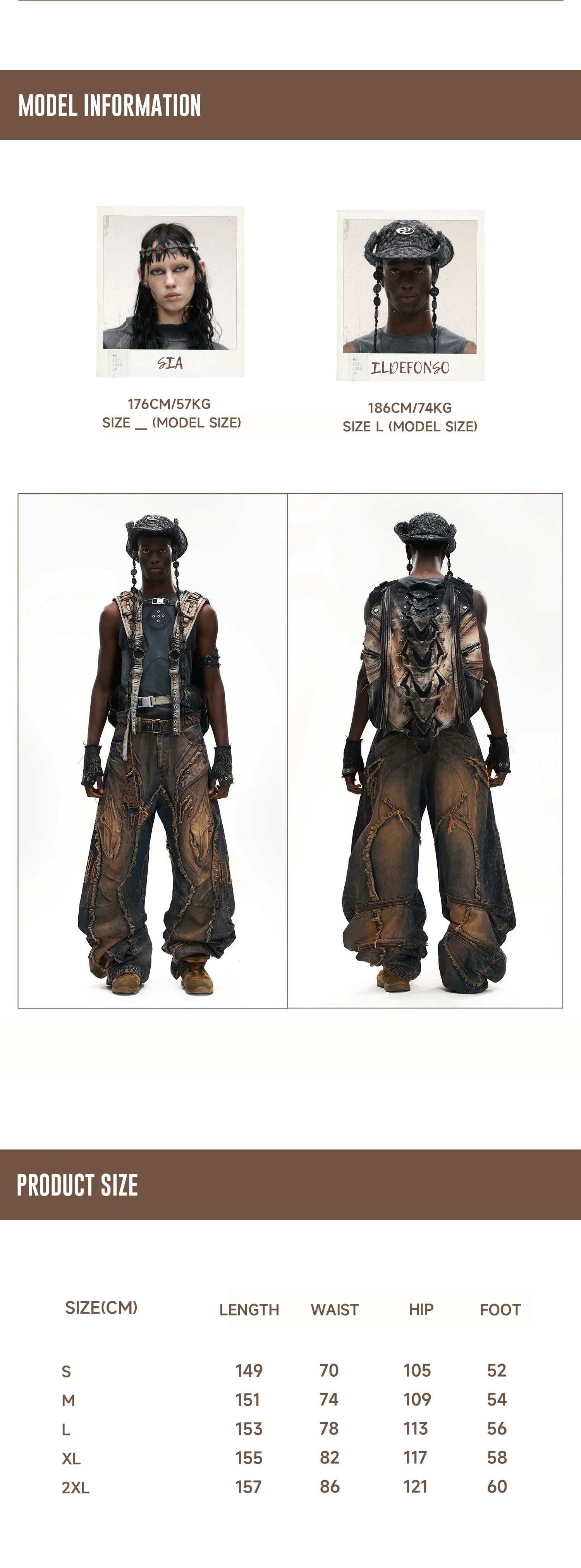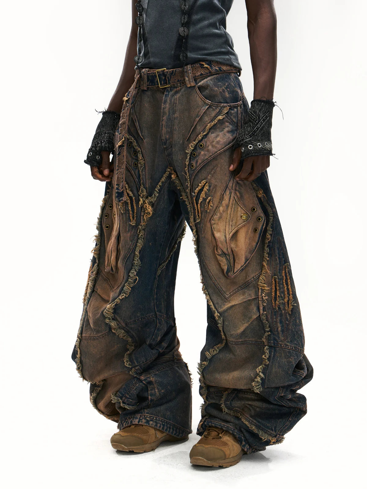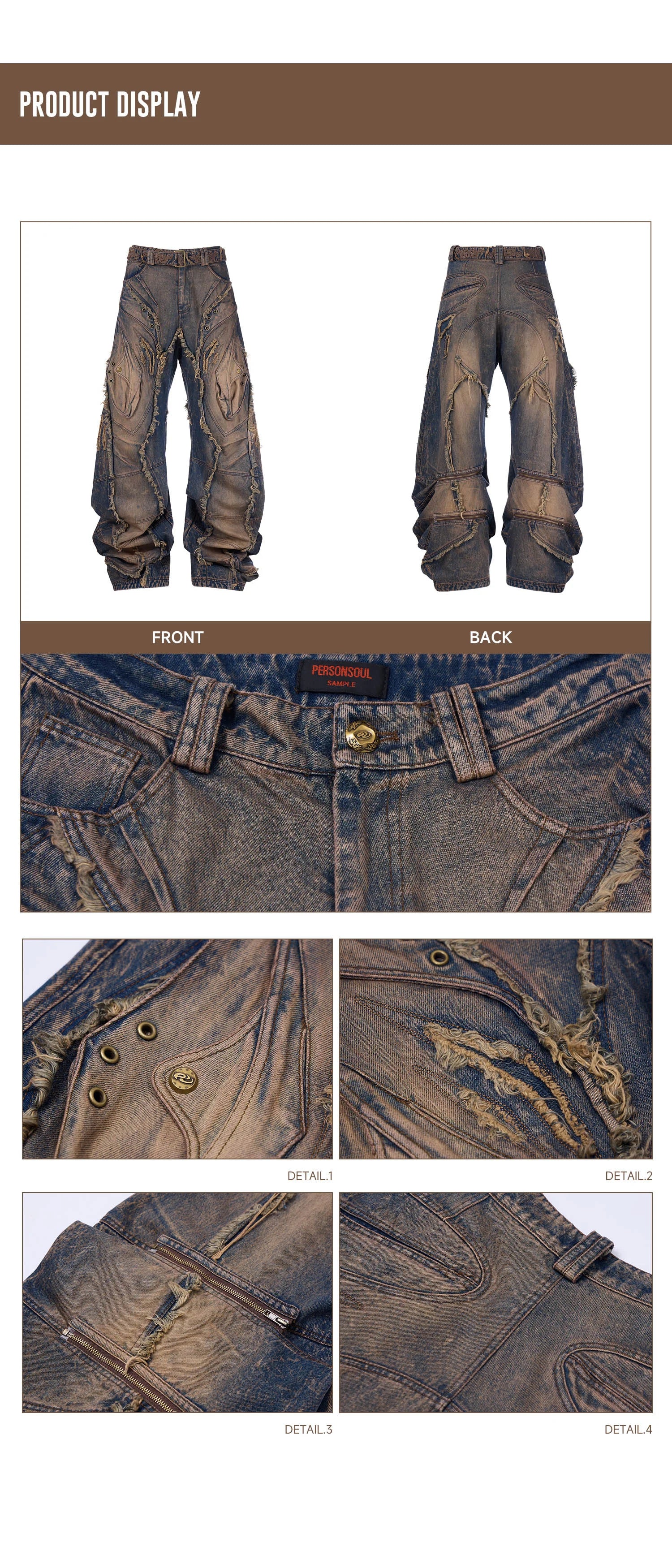 Vintage Wash Curved Leg Patchwork Jeans with Adjustable Length