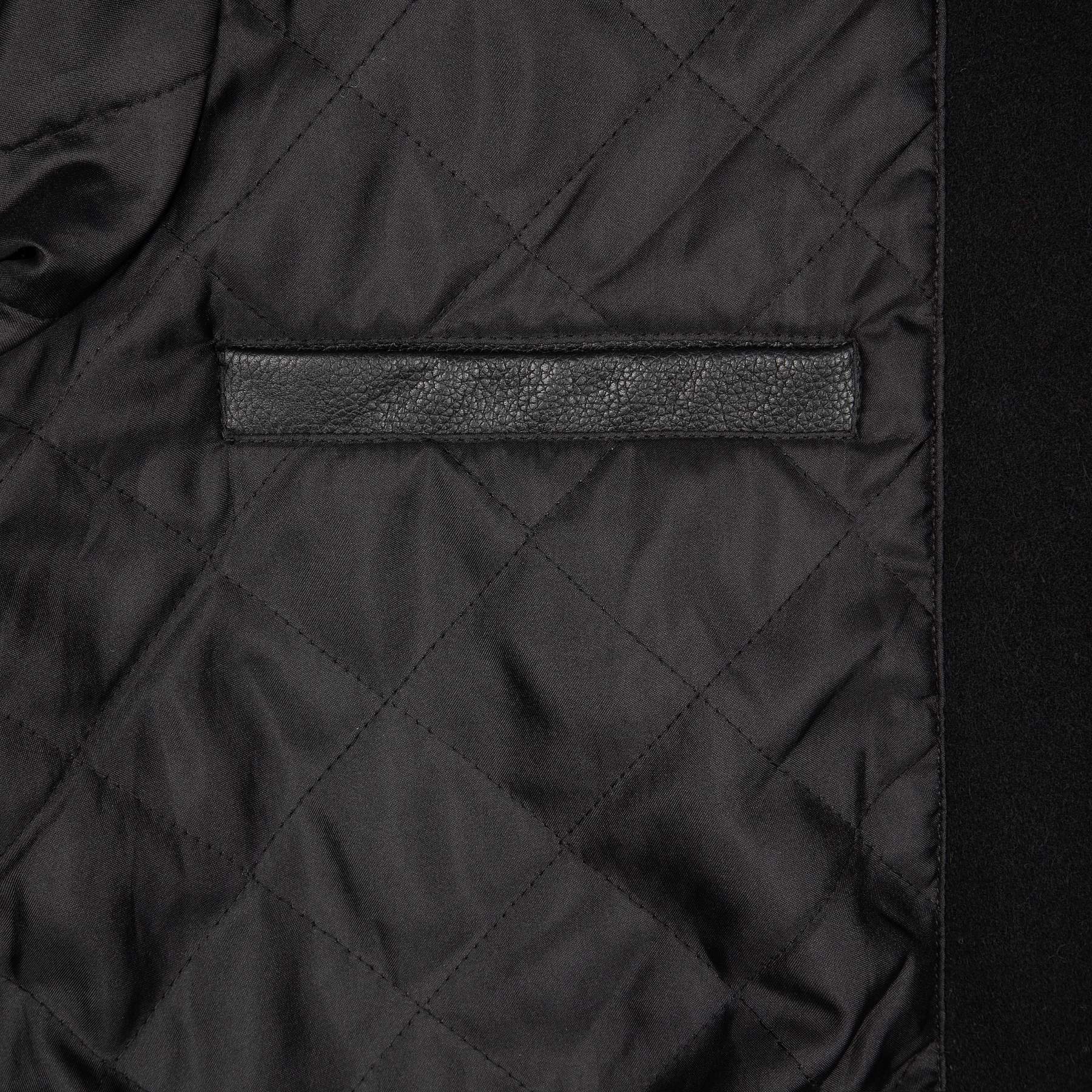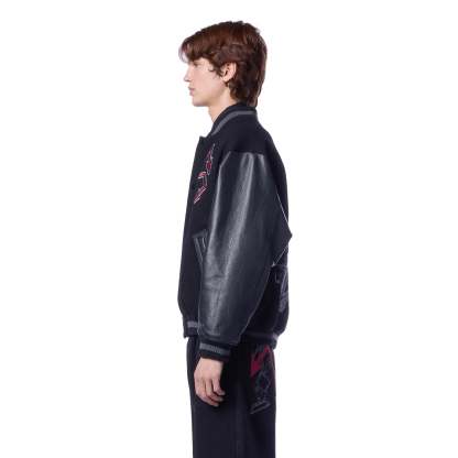 wool fabric / 100% plain leather sleeves / polyester lining / ribbed hem and cuffs / embroidery on front and back / leather appliqué embroidery on front chest / with YKK zipper / fits true to size
