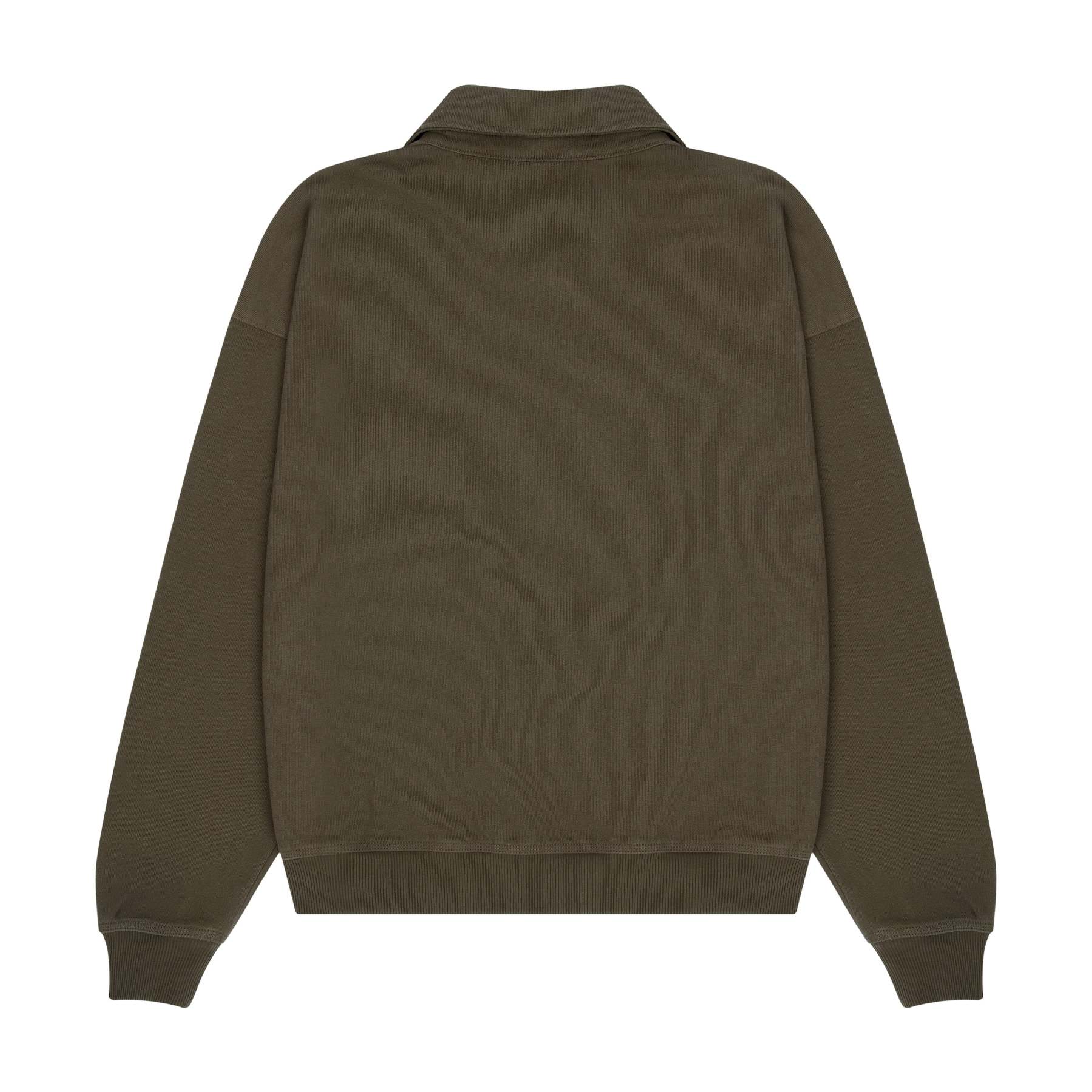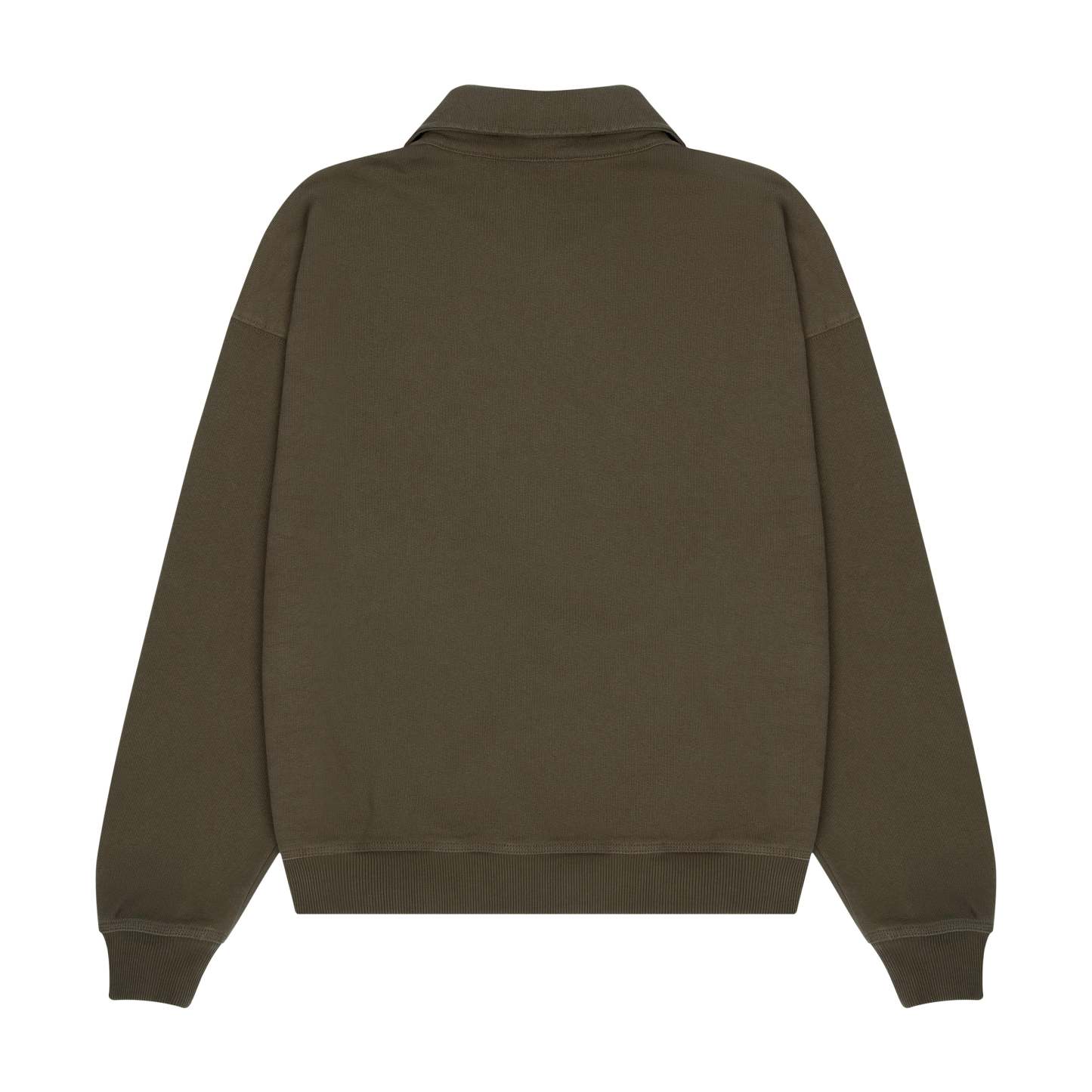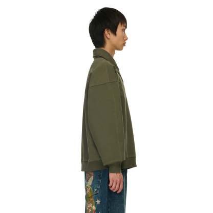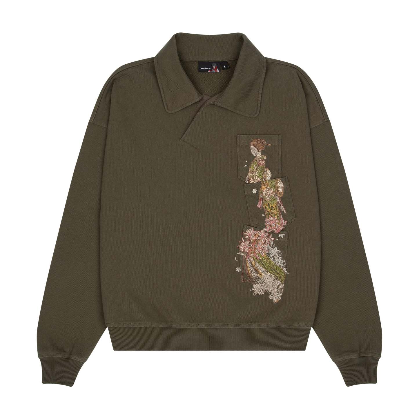 480gsm / 100% preshrunk cotton / embroidered pocket details on front / asymmetric collar with buttons inside / fits true to size