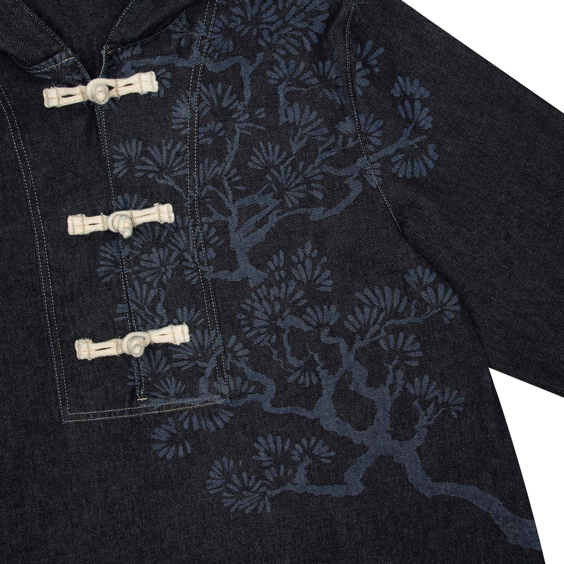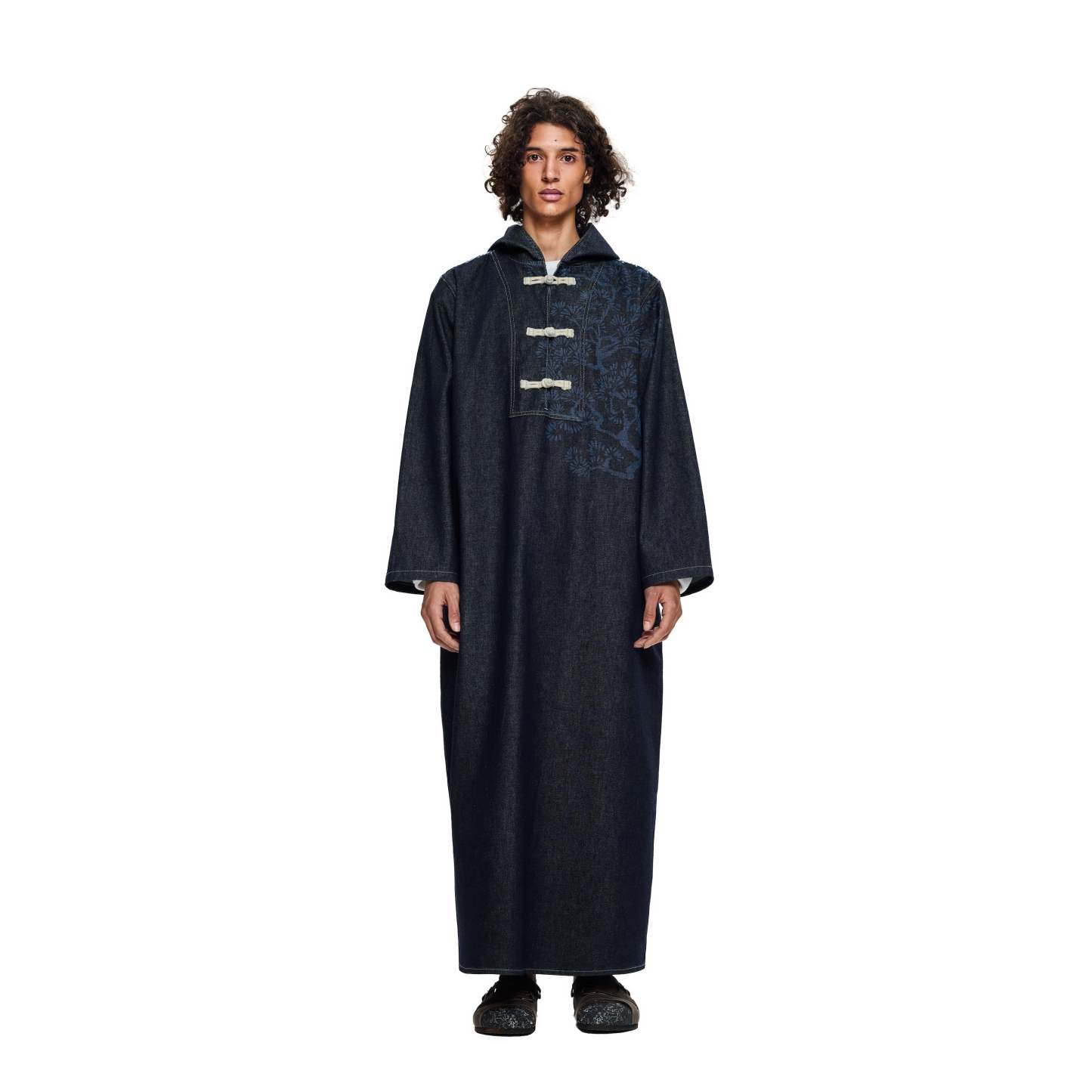 11oz raw denim / 100% cotton / laser print on front / boro style patchwork on back robe / closure cord / wash inside out / fits true to size / all profits will be donated